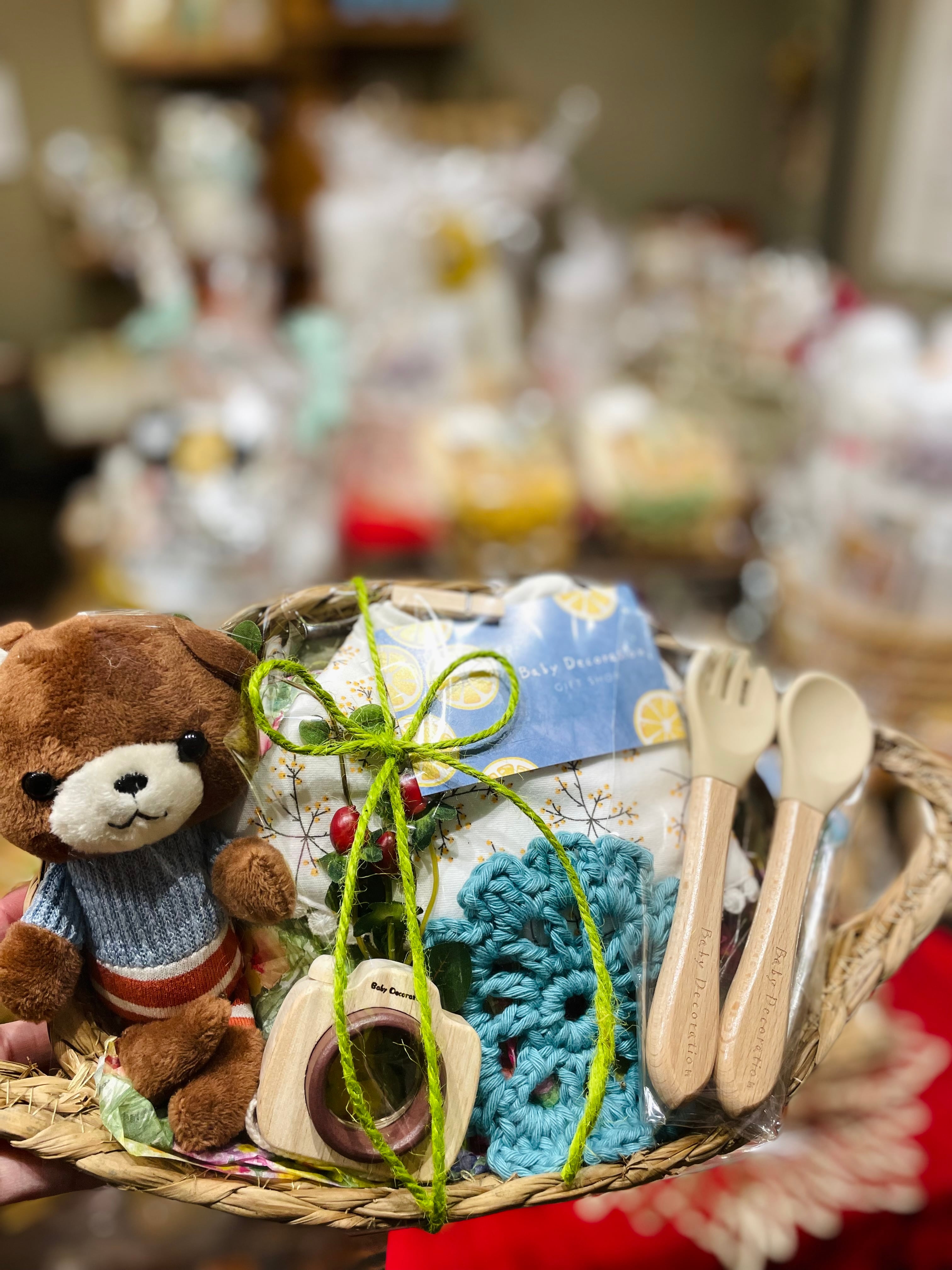 ちぃさなカメラのおもちゃとスタイ、べびでこオリジナルのスプーン&フォークセットがおしゃれなカゴに入っています。