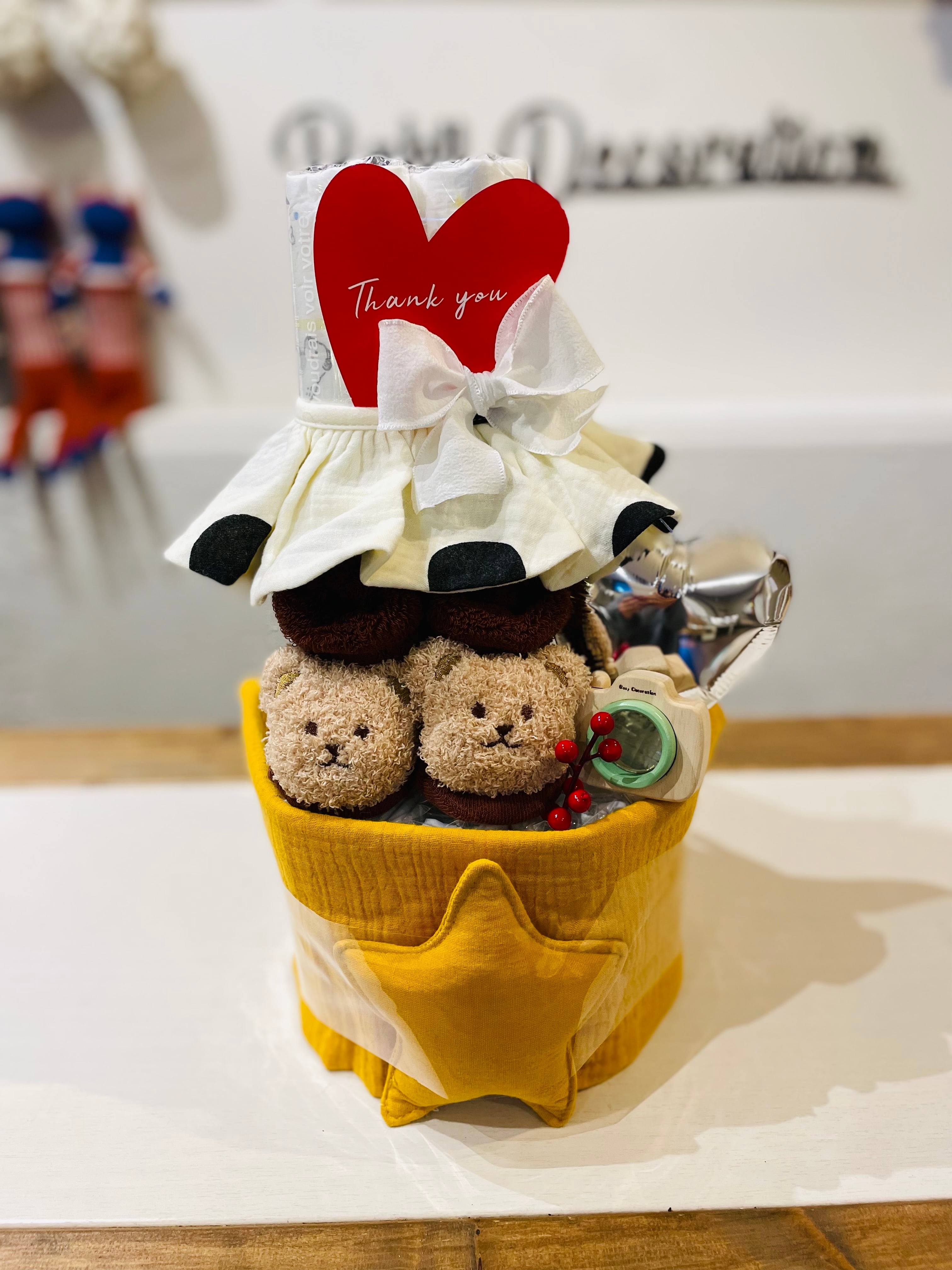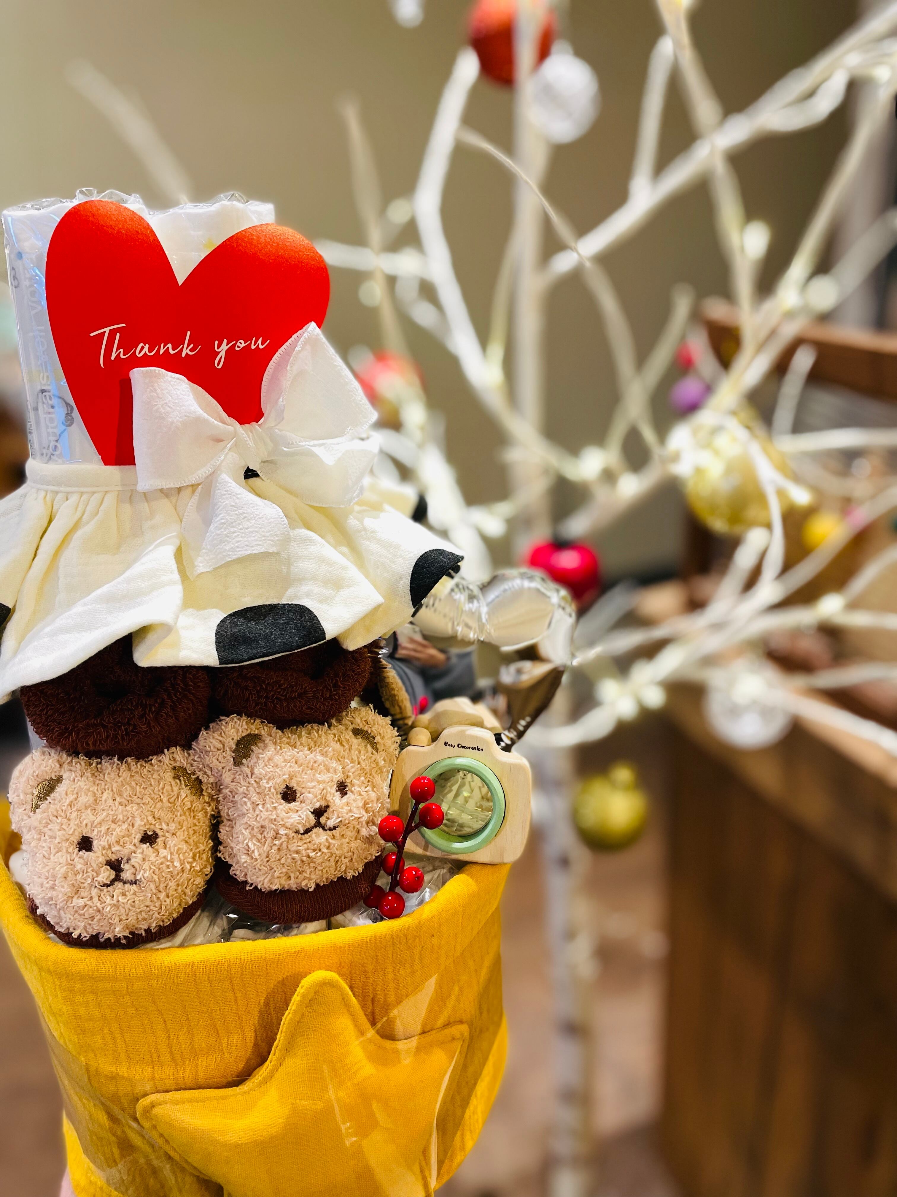 あかちゃんもお気に入り!星型のマスコットが付いたタオルに、あったかフワフワくまさんの靴下がついたおむつケーキが登場っ!